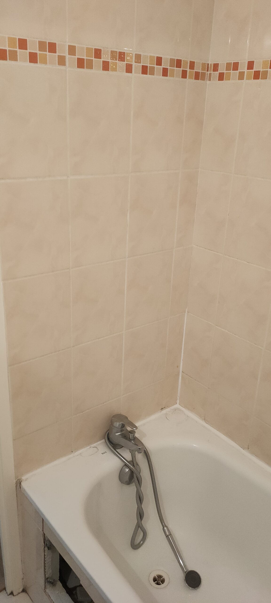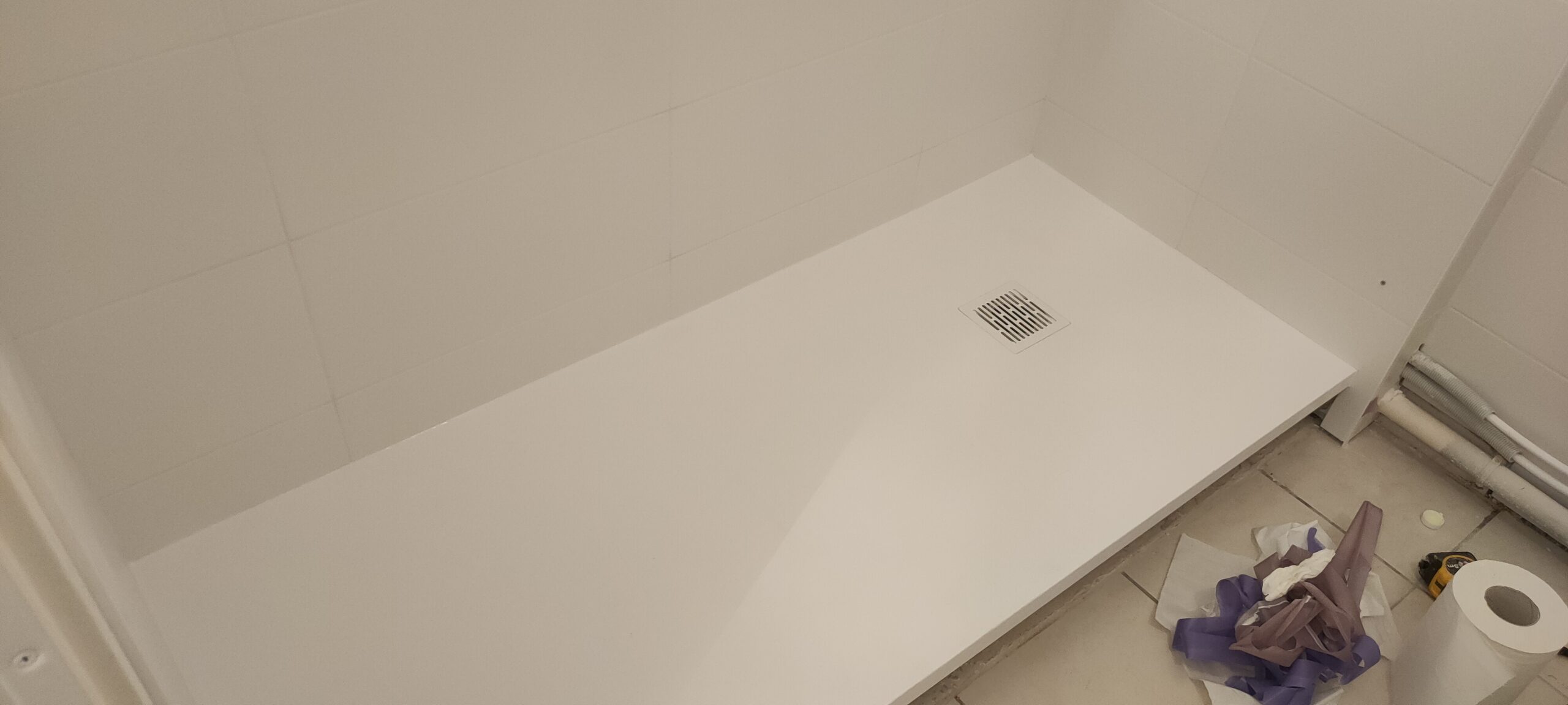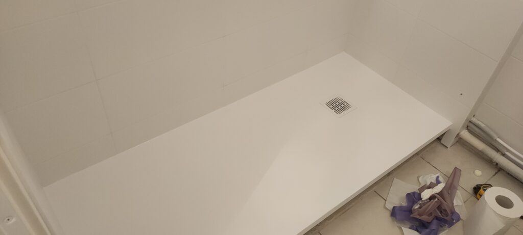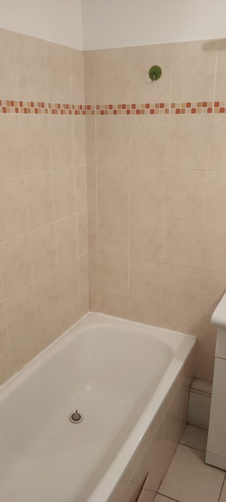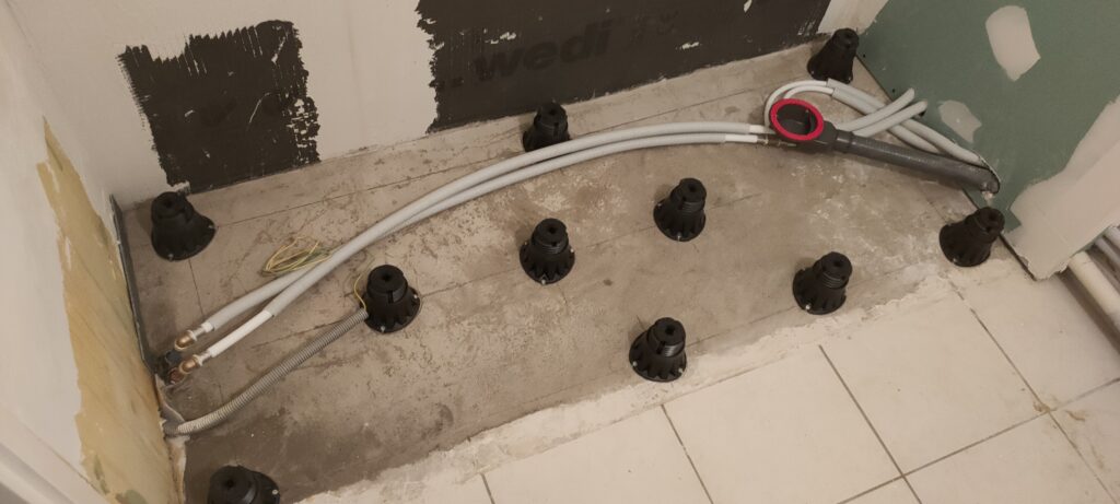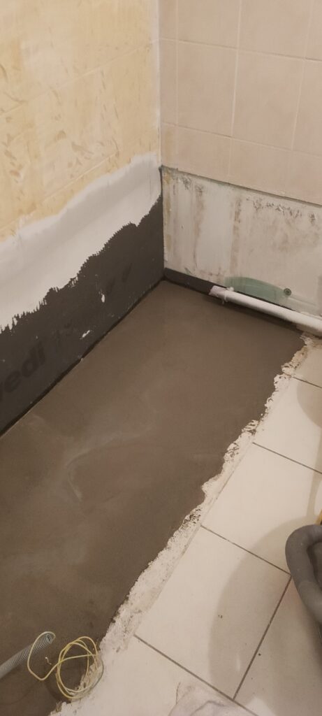 – Reprise du sol sous baignoire pour pose receveur de douche sur plots (nettoyage + chape)